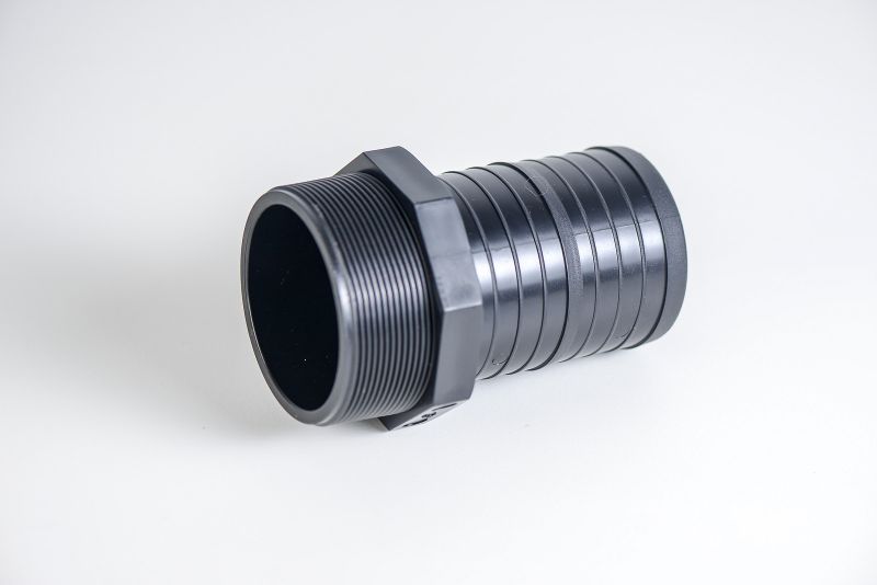 Фитинг выполнен из высокотехнологичного инженерного пластика. Представляет собой переходник с наружной резьбой 3”BSPTс одной стороны и двуступенчатого ерша , диаметром 75 -77мм. Применяется для подсоединения плоско-сворачиваемого рукава Лейфлет диаметром 77 мм к резьбовой арматуре с внутренней резьбой 3”BSPT.