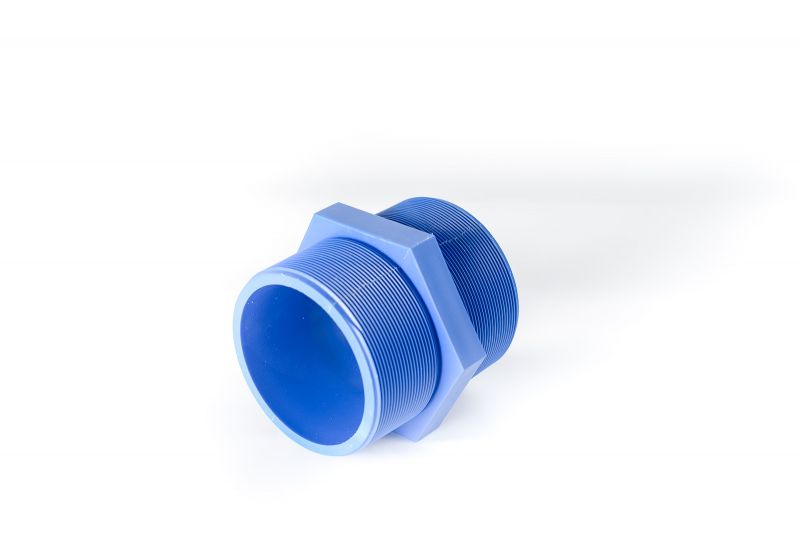 Фитинг предназначен для соединения 2-х арматурных изделий с внутренней резьбой между собой. Изготовлен из высококачественного инженерного пластика черного либо синего цвета. С двух сторон изделия выполнена наружная резьба по стандарту BSPT размером 4”.При монтаже целесообразно использовать уплотнитель резьбы – фум ленту.