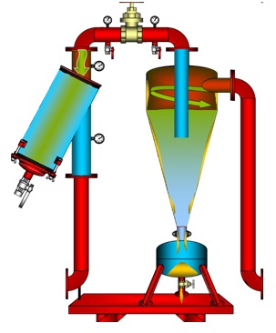 В общих чертах принцип работы центробежного фильтра заключается в поступлении загрязненной воды в корпус устройства через специальный патрубок с последующим нисходящим движением вращающегося потока. Под действием центробежной силы отсеиваются взвешенные загрязняющие частицы, которые переносятся вторичным потоком в специальную емкость.